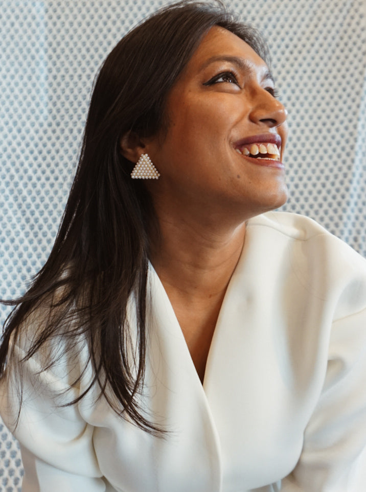 These pearl-encrusted triangle earrings feature 120 hand-placed pearl beads for a clean, elegant finish. Each side measures 27.3mm, creating a bold yet timeless shape.